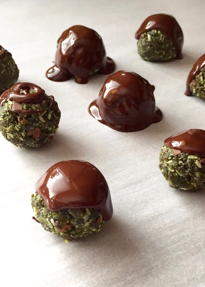 - Spoon a teaspoon of chocolate and spread/drizzle over bliss ball. Repeat with all the remaining balls until finished.