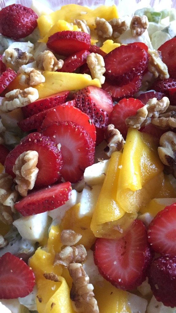 - Place strawberries on top of the salad for a pretty look. Do not mix it before serving (this is to make it look presentable)