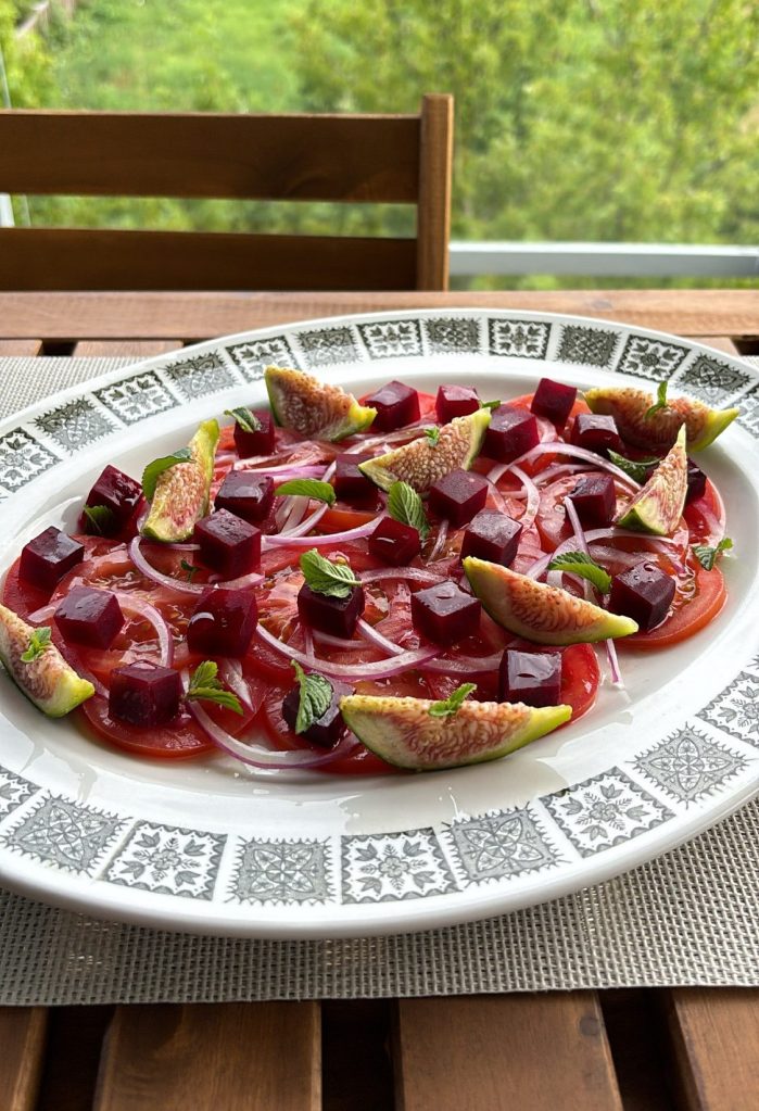 - Assemble the salad: Lay the tomato slices in a single layer on a large plate or platter. Top with the cooled diced beets, fig quarters, and red onion slices.