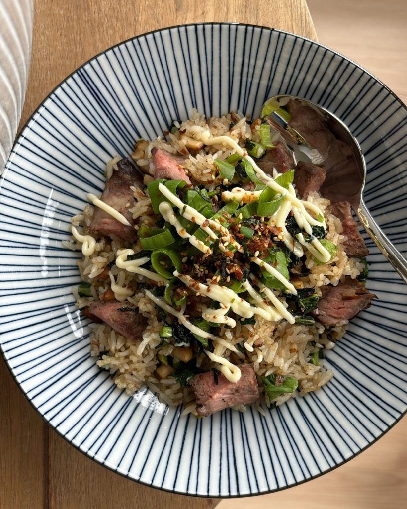 Flavourful and buttery fried rice using leftover steak and vegetables. Top it off with some Japanese mayo and furikake for a delicious and umami-filled meal.